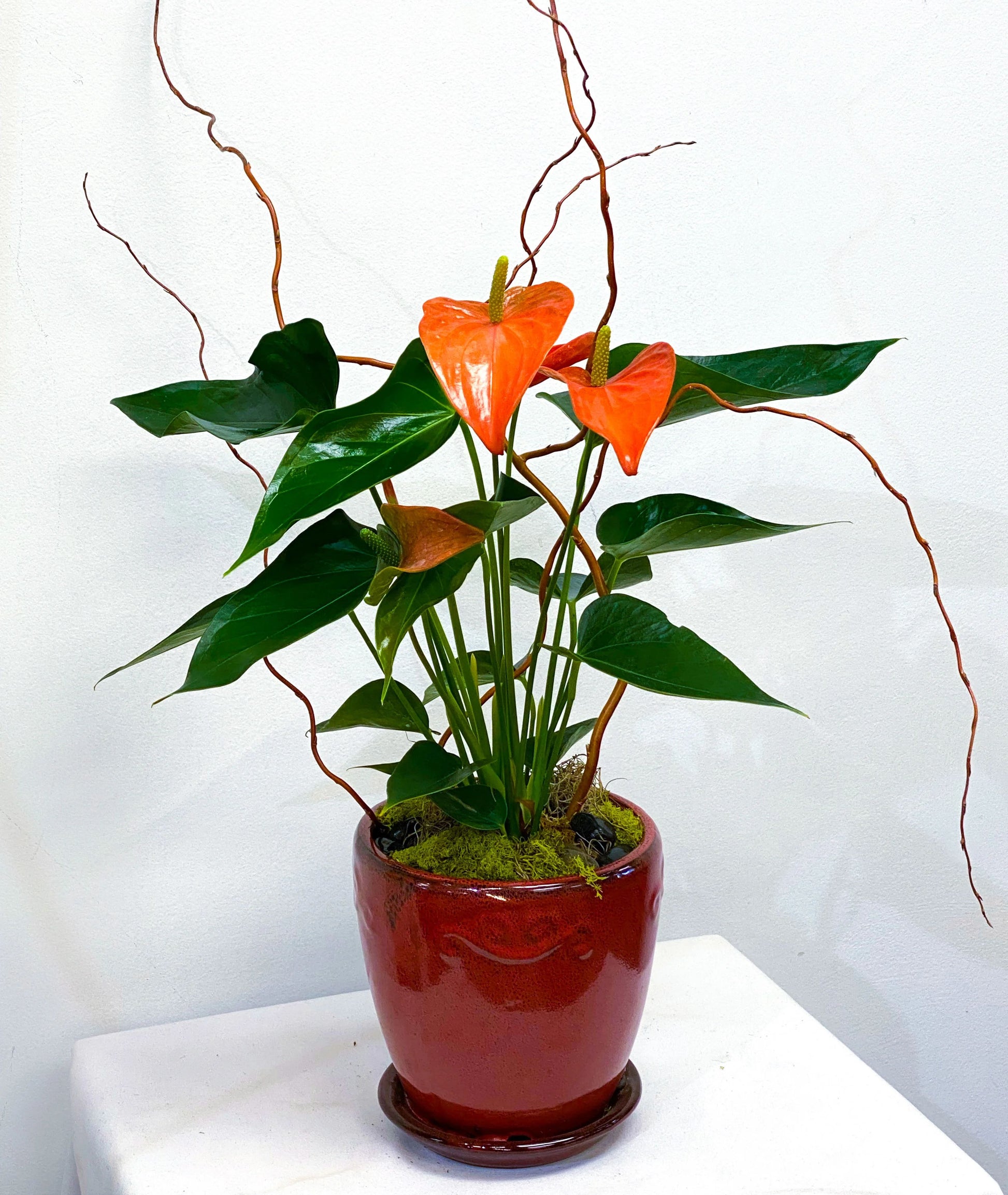 Anthurium plant potted in a glazed 6" by 6" round container with attached saucer. Anthurium plant is dressed with 3 different types of moss, black river rock, and curly willow accents. Blooms last between 2-3 months and can re-bloom year-round. Care instructions included.