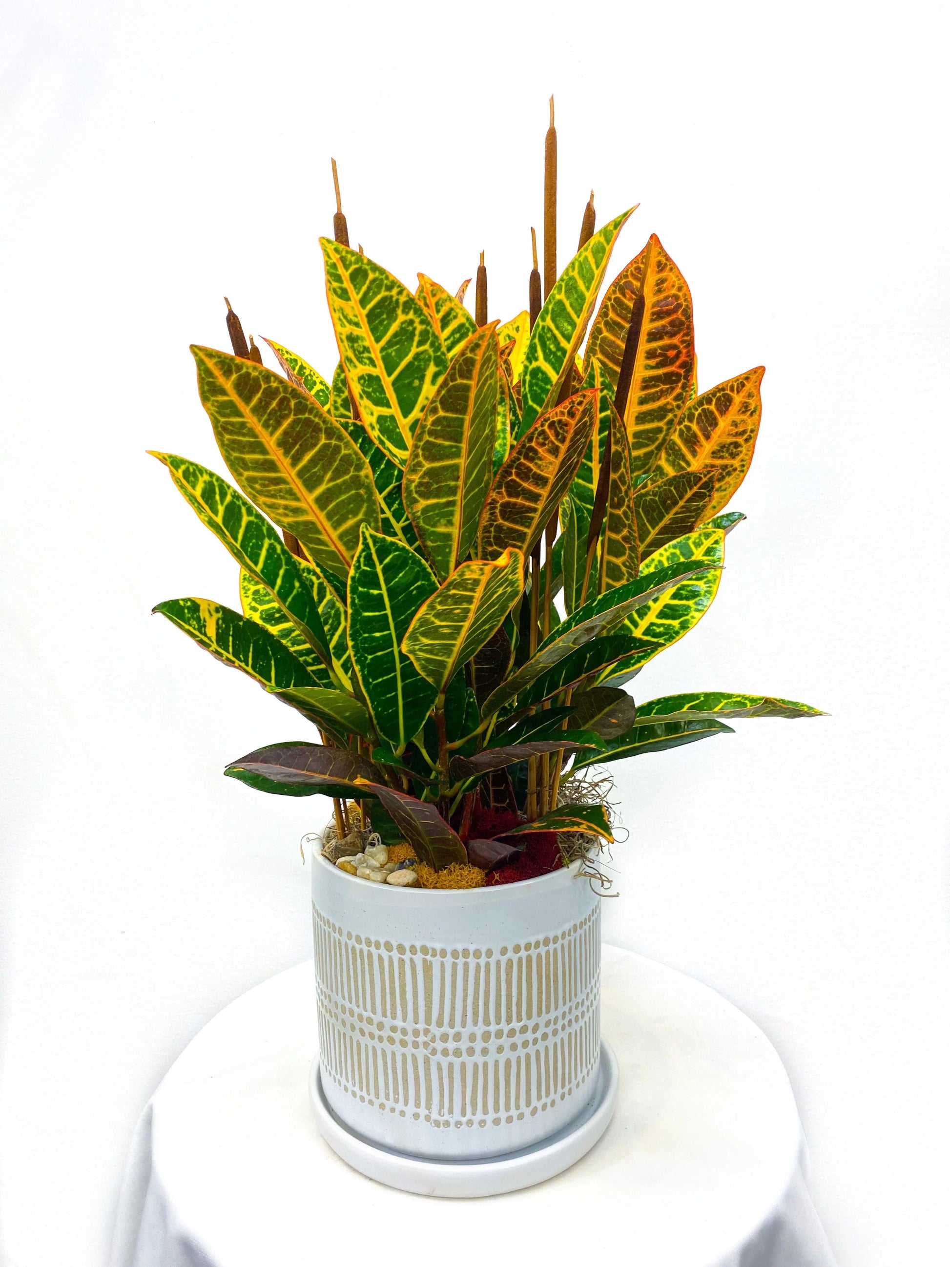 Features a showy golden croton plant with finishing accents of cattails, river rock, and decorative moss to give you that cozy fall feeling. It is planted in a neutral and textured container with a matching saucer.