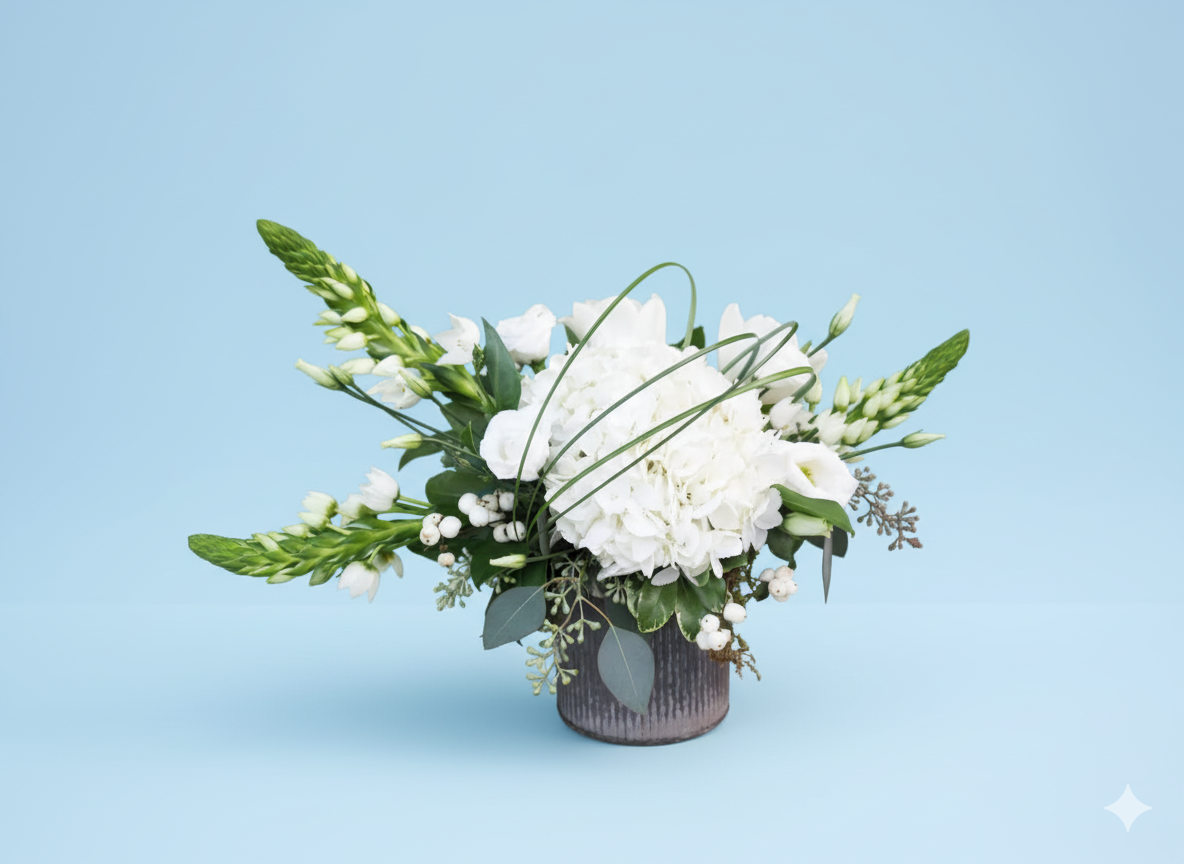 Collection of all white flowers in an industrial corrugated metal vessel. Features hydrangea and other stunning white flowers with mixed greens.