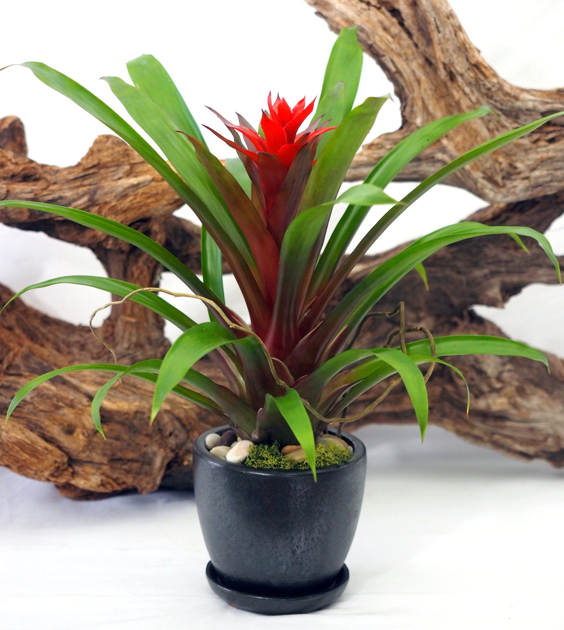 Fresh bromeliad plant potted in a glazed ceramic container with attached saucer and dressed with natural accents of curly willow, moss and river rocks. Blooms can last 3-6 months.