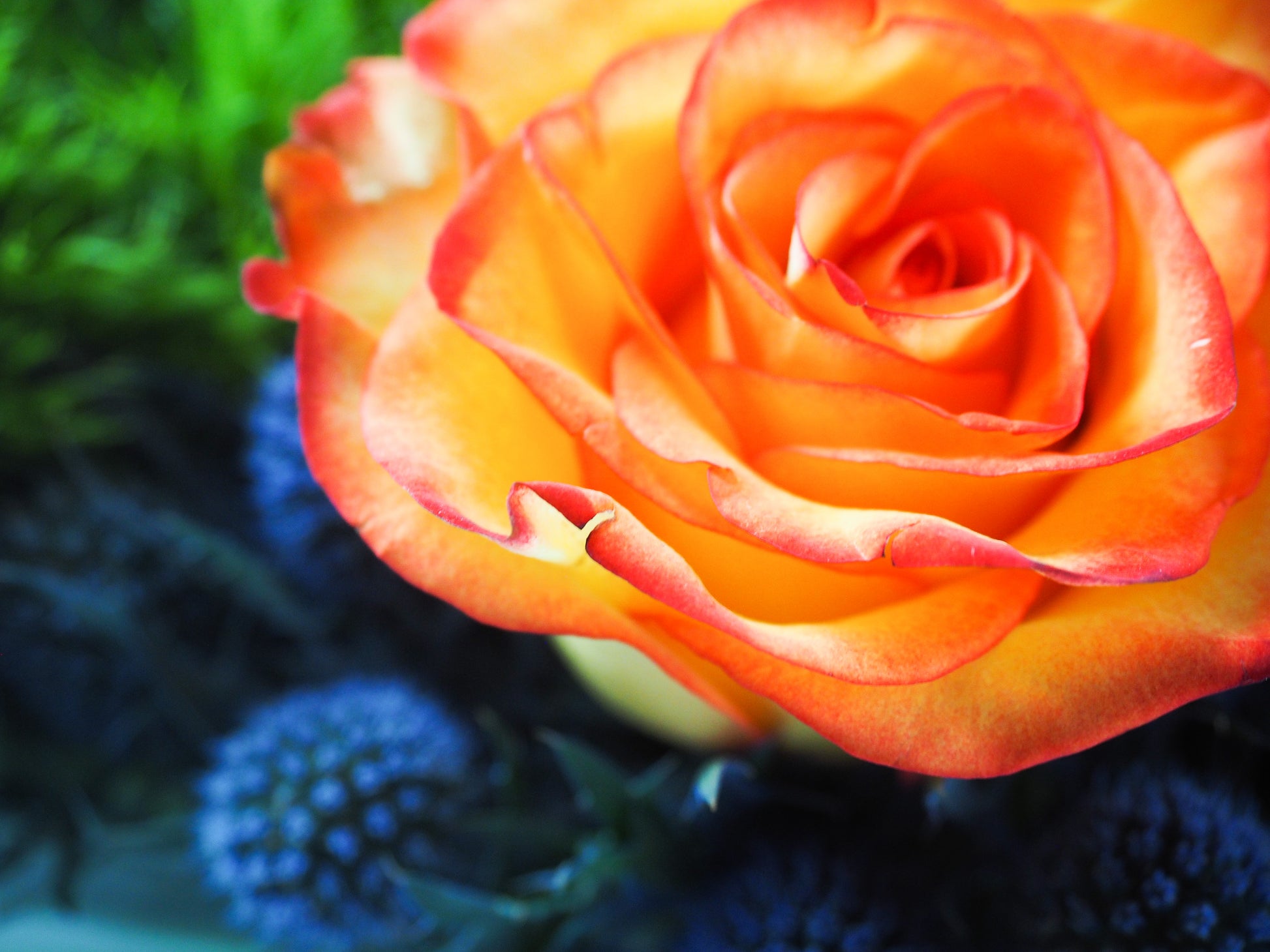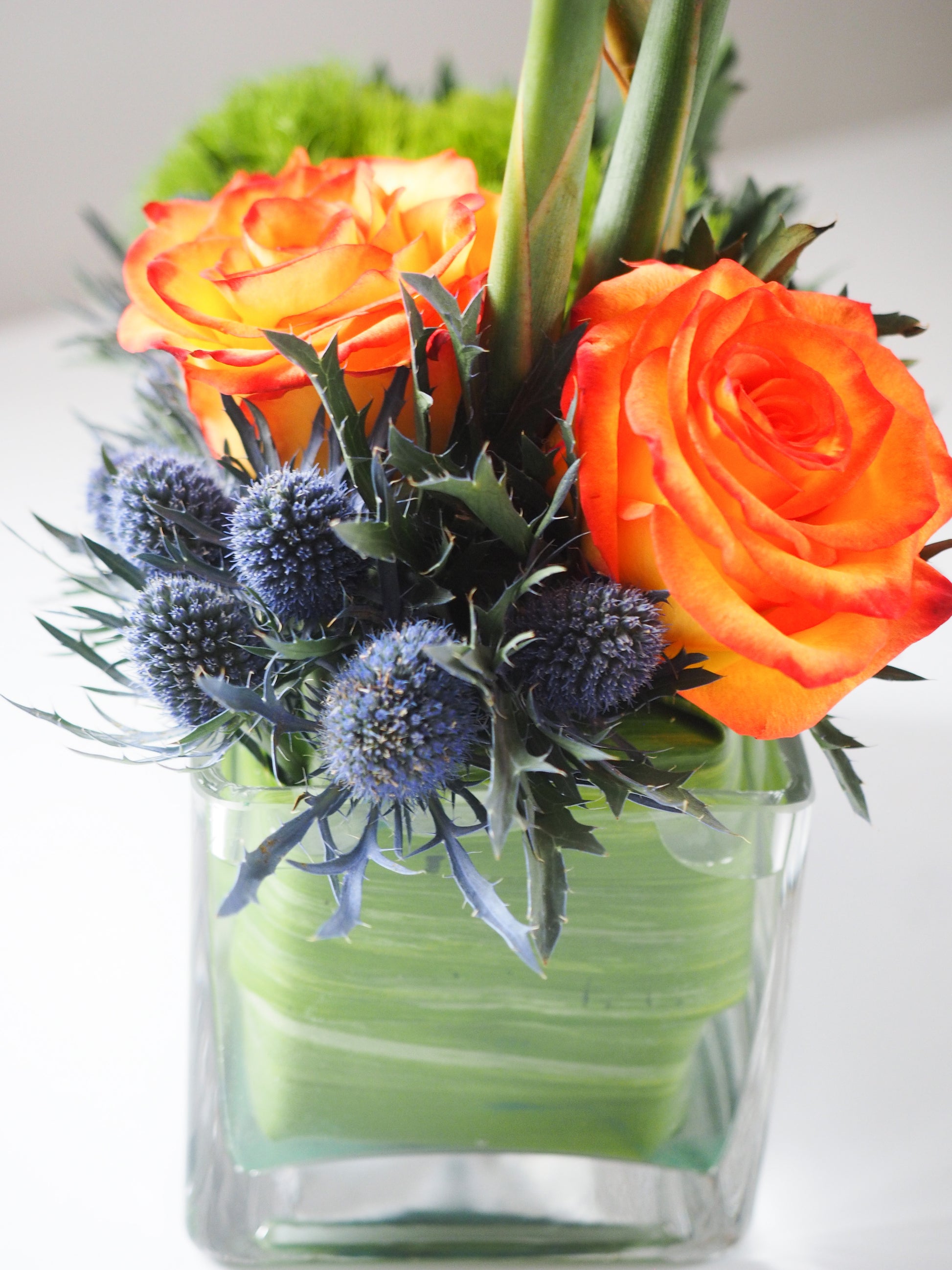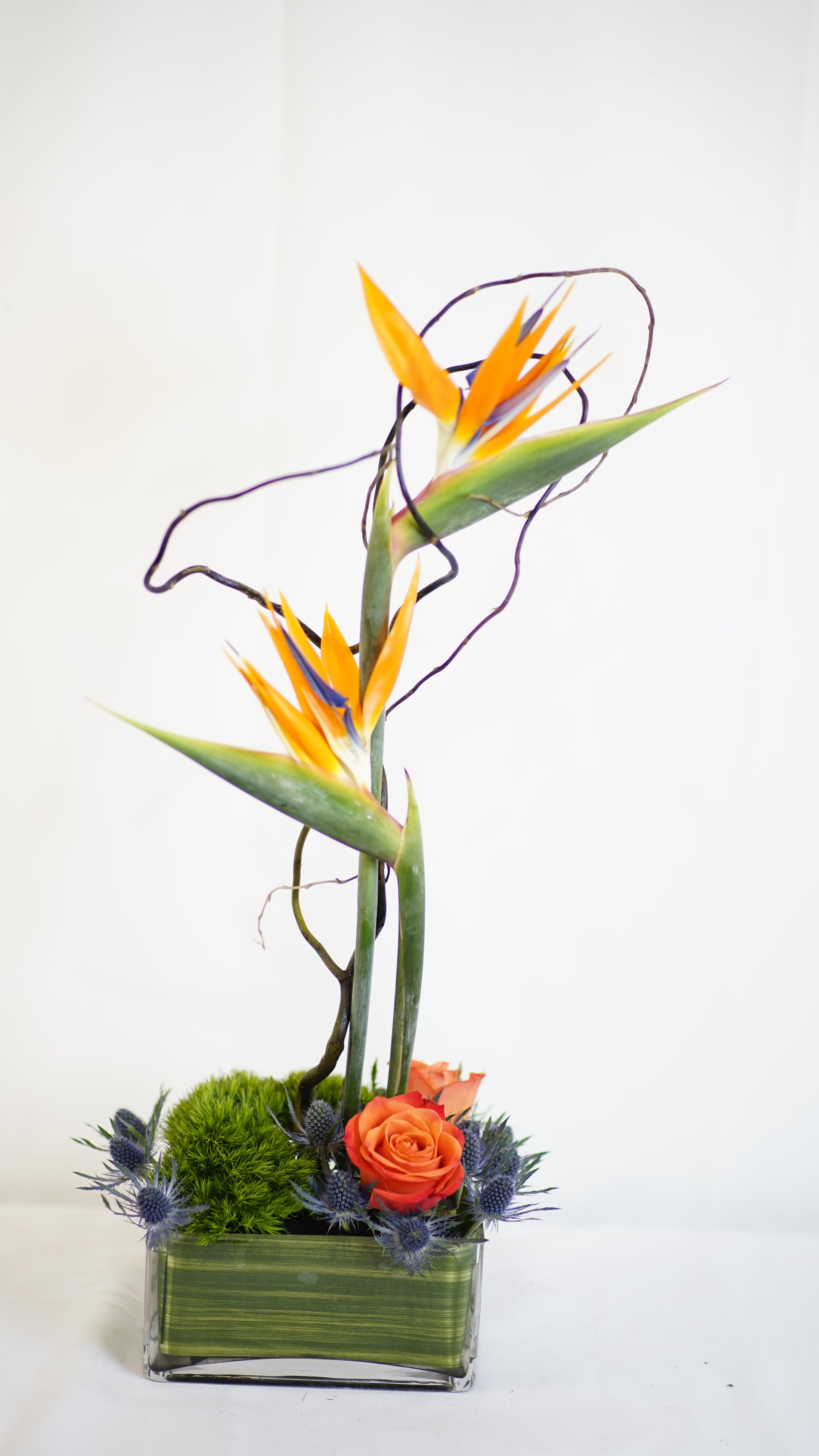 This striking arrangement features tropical bird of paradise, bi-color orange roses, green trick dianthus, thistle, and curly willow in a leaf-lined glass vase. This eye-catching arrangement is sure to leave a lasting impression.